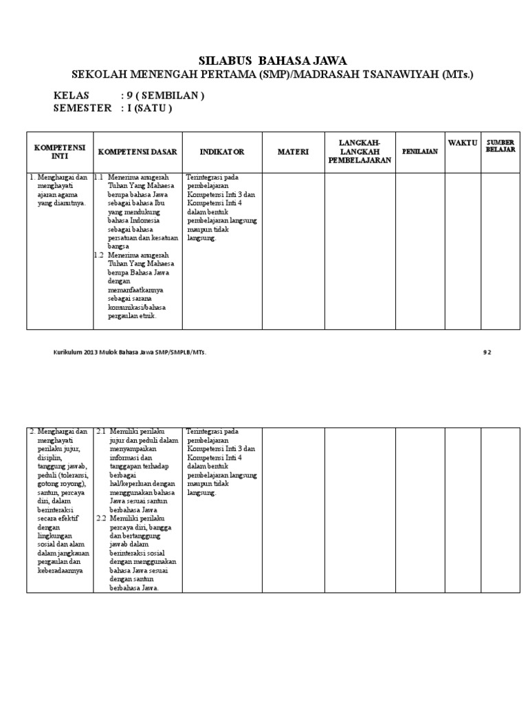 Silabus Bahasa Jawa Kelas 6 from imgv2-2-f.scribdassets.com Berikut cakupan isi yang terdapat dalam rpp/silabus/prota/promes bahasa jawa sd/mi 1,2,3,4,5,6 ktsp 2015 yang terdapat dalam link download di bawah ini. Download bahasa jawa kelas 4 sem 2 apk android game for free to your android phone. Perangkat pembelajaran k13 yang dibagikan yaitu silabus, rpp (rencana pelaksanaan pembelajaran), promes (program semester). Silabus mulok(basa jawa) kelas iv anyar semester 2. Dimana masing masing semester terbagi atas 4 tema di semester 1 dan 4 tema di semester 2. | rpp/silabus/prota/promes bahasa jawa sd/mi kelas 4 ktsp 2015. Tujuannya penyusunan silabus bahasa arab mi semester 1 adalah untuk memaksimalkan kegiatan belajar mengajar pada materi baik didalam maupun diluar kelas. Silabus kelas 1 semester 2.