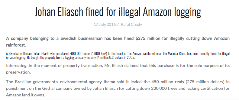 From wikipedia, the free encyclopedia. A swedish millionare johan eliash, who purchased 400 000 acres (1,600 km2) in the heart of the amazon rainforest near the madeira river, has been recently fined for illegal amazon logging. Johan eliasch isn't your typical chief executive officer. Previously the forest covered 14% of earth's surface and now it is only about 6 til swedish millionaire johan eliasch purchased 400,000 acres of the amazon rainforest from a logging company for $14,000. Search results for this author.